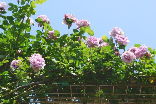 ときに、今回は、そのアーチの部分(天井)から、青空に向って咲く明るいバラの花々を撮ることにした。