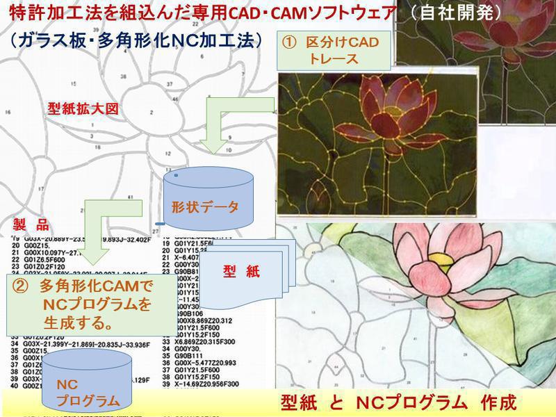 ガラスピースの工業生産化のことで、ステンドグラス専用CAD・CAMソフトウェアシステムを中心にした独自の多品種少量生産システムです。
