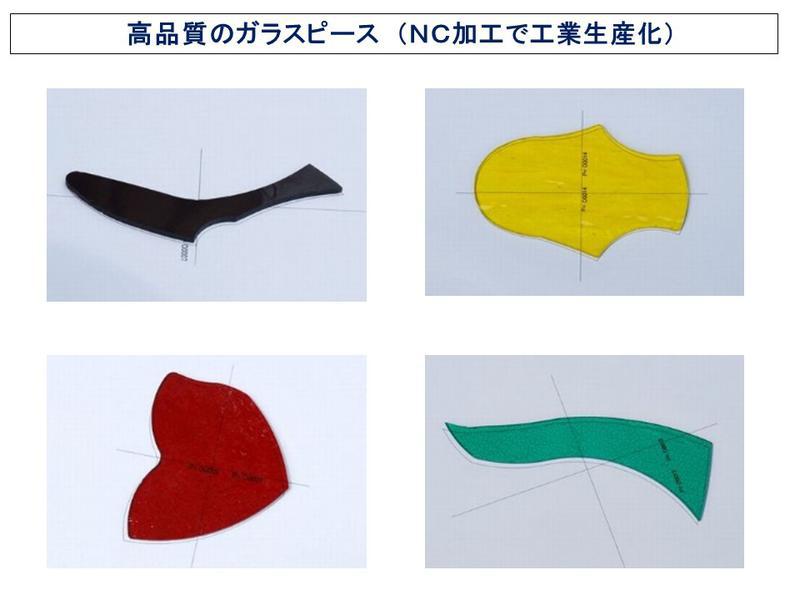 しかし、私達が目指す縁なしステンドグラス商品を構成する『高品質の自由形状・ガラスピース(部品)』は、手作りが難しく、商品も殆ど市場に存在しなかった。